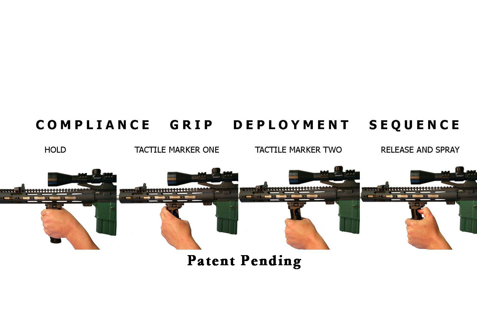 The problem is solved by a compliance device built into the fore grip of the firearm. With an integrated compartment for this alternative compliance device, such as a paper spray canister, aligned with the firearm’s muzzle and designed for the clearance required for deployment, the use of a non-lethal alternative becomes much more likely. We call this patent pending device "Compliance Grip".